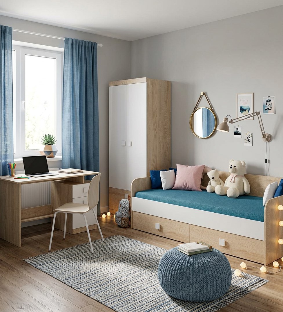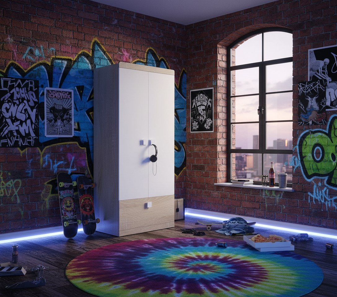 Оттенок натурального дерева "дуб сонома" дает ощущение комфорта и единения с природой, а воздушный белый цвет в интерьере работает как основа для ярких штрихов.