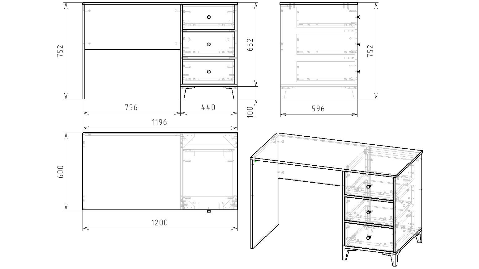 В стол встроены три выдвижных ящика на направляющих скрытого монтажа с доводчиками.
