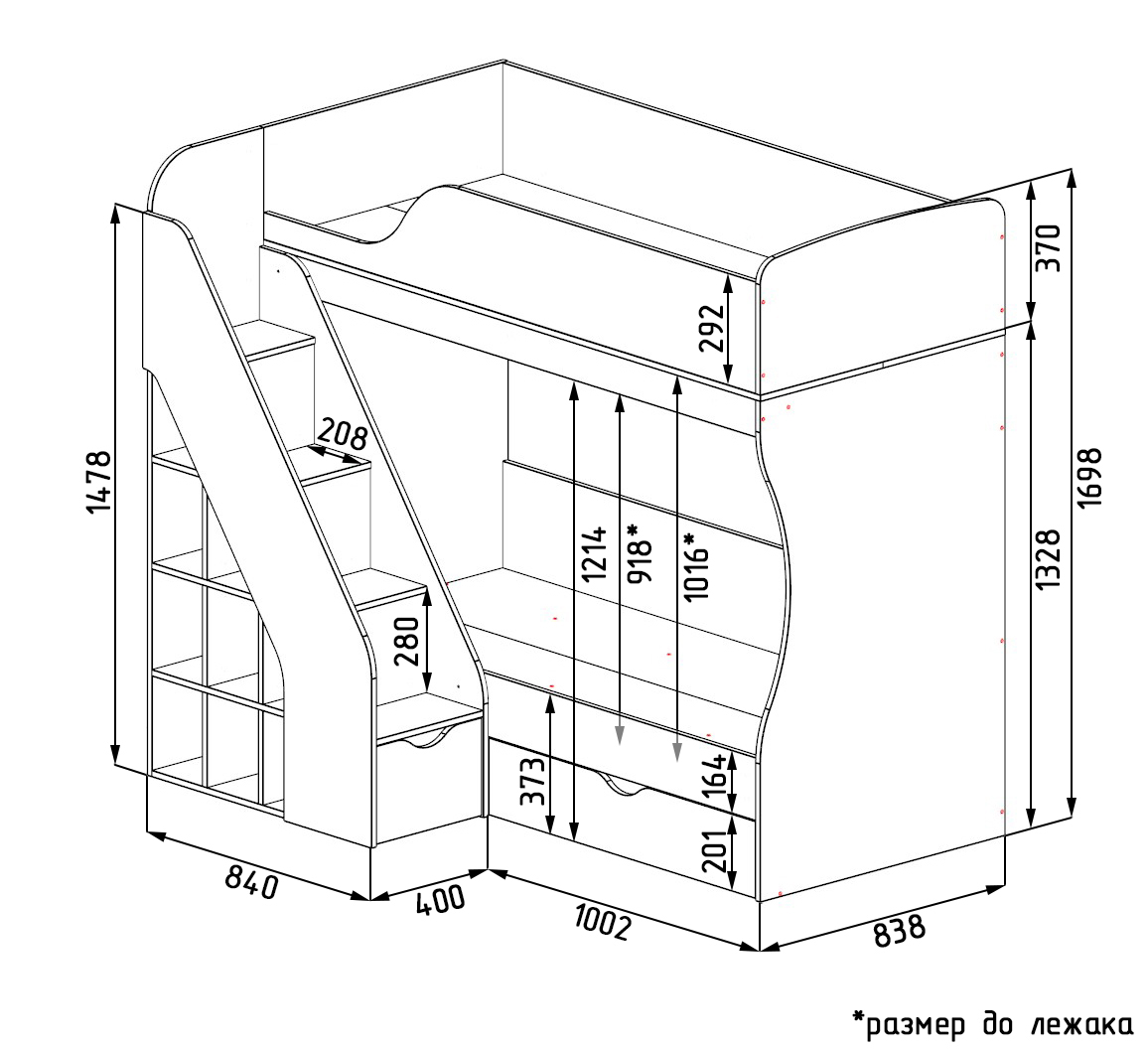 Габариты кровати: ширина 1842 х высота 1698 х глубина с учетом лестницы 1242 мм
