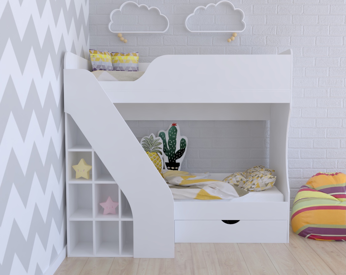 В нижнюю кровать встроен выдвижной ящик для белья и игрушек.