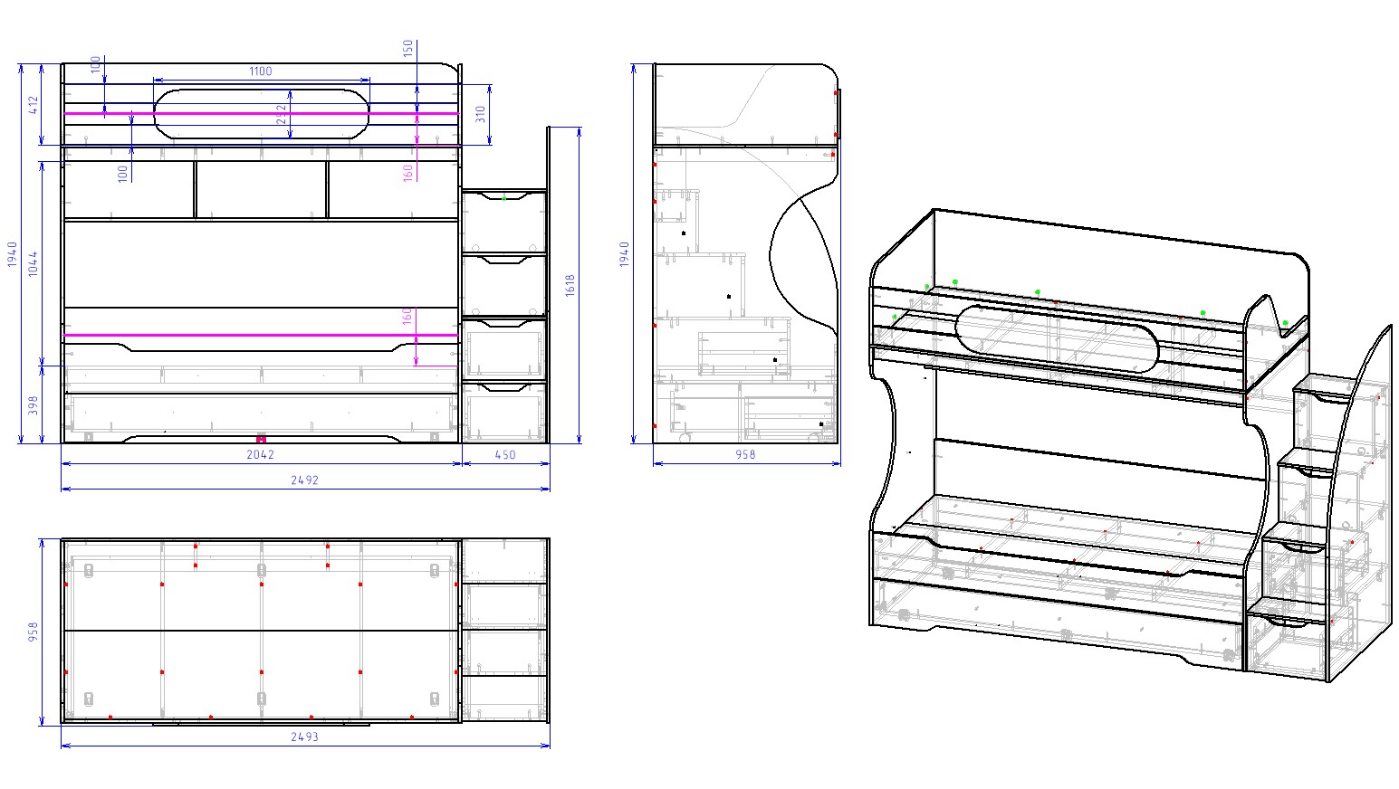 Габариты кровати: ширина 2493, глубина 958, высота 1940 мм