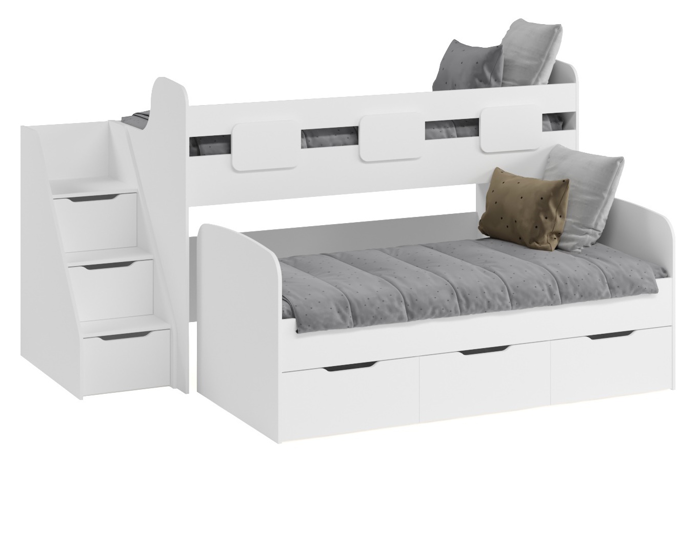 Высокая нагрузка на спальные места. Прочные ящики на шариковых направляющих скрытого монтажа с доводчиками. Высокий безопасный борт |