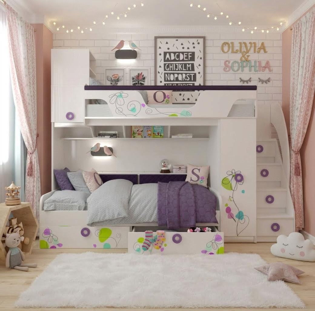 В кровать встроен шкаф для размещения одежды (внутри шкафа имеются штанга для белья и полки) и удобная лестница с ящиками для игрушек.