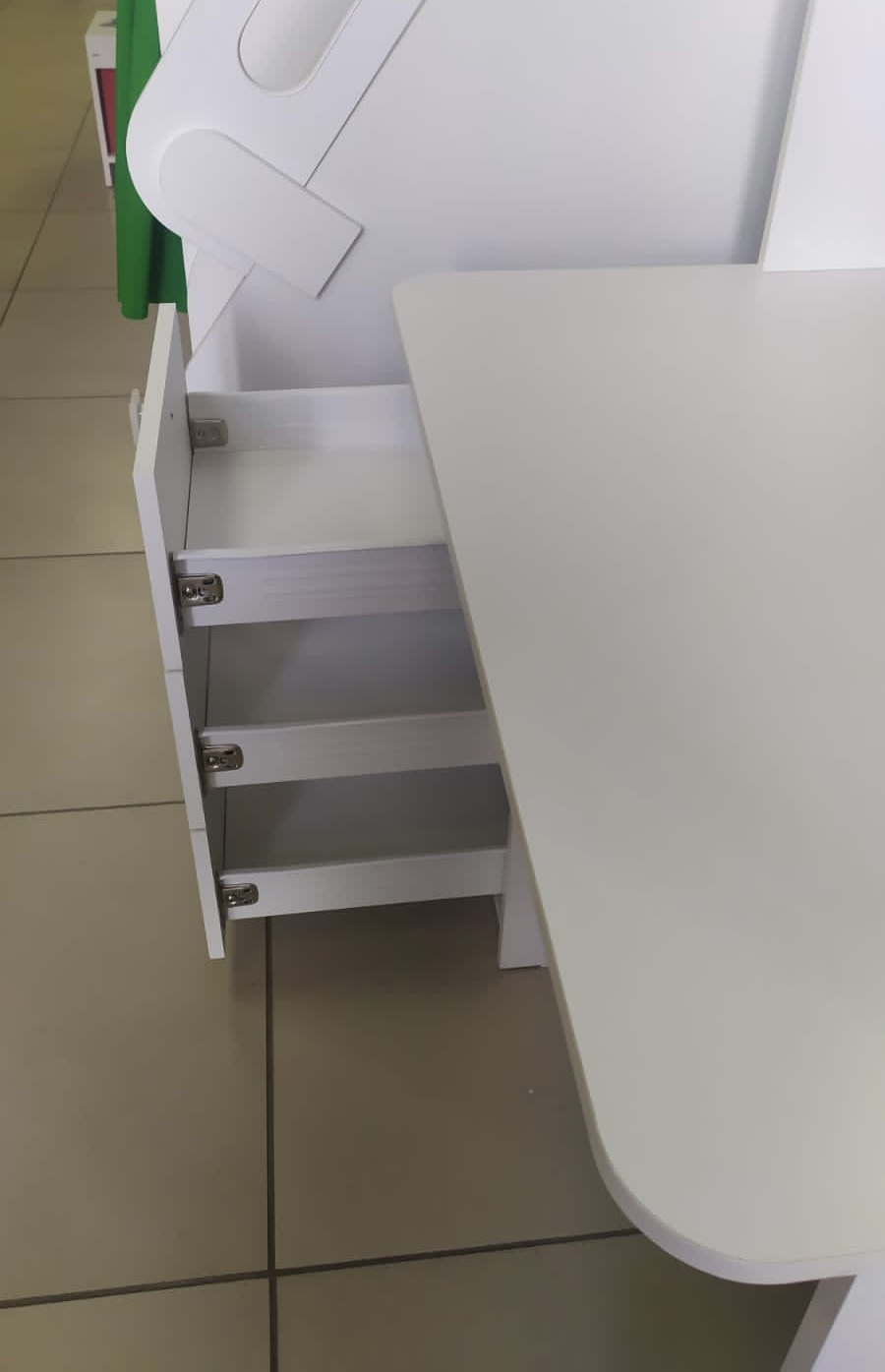 Выдвижные ящики изготовлены с помощью метабоксов, что делает изделие надежным и практичным.