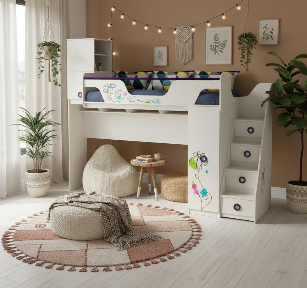 В кровать встроены шкаф для размещения одежды и удобная лестница с ящиками для игрушек.