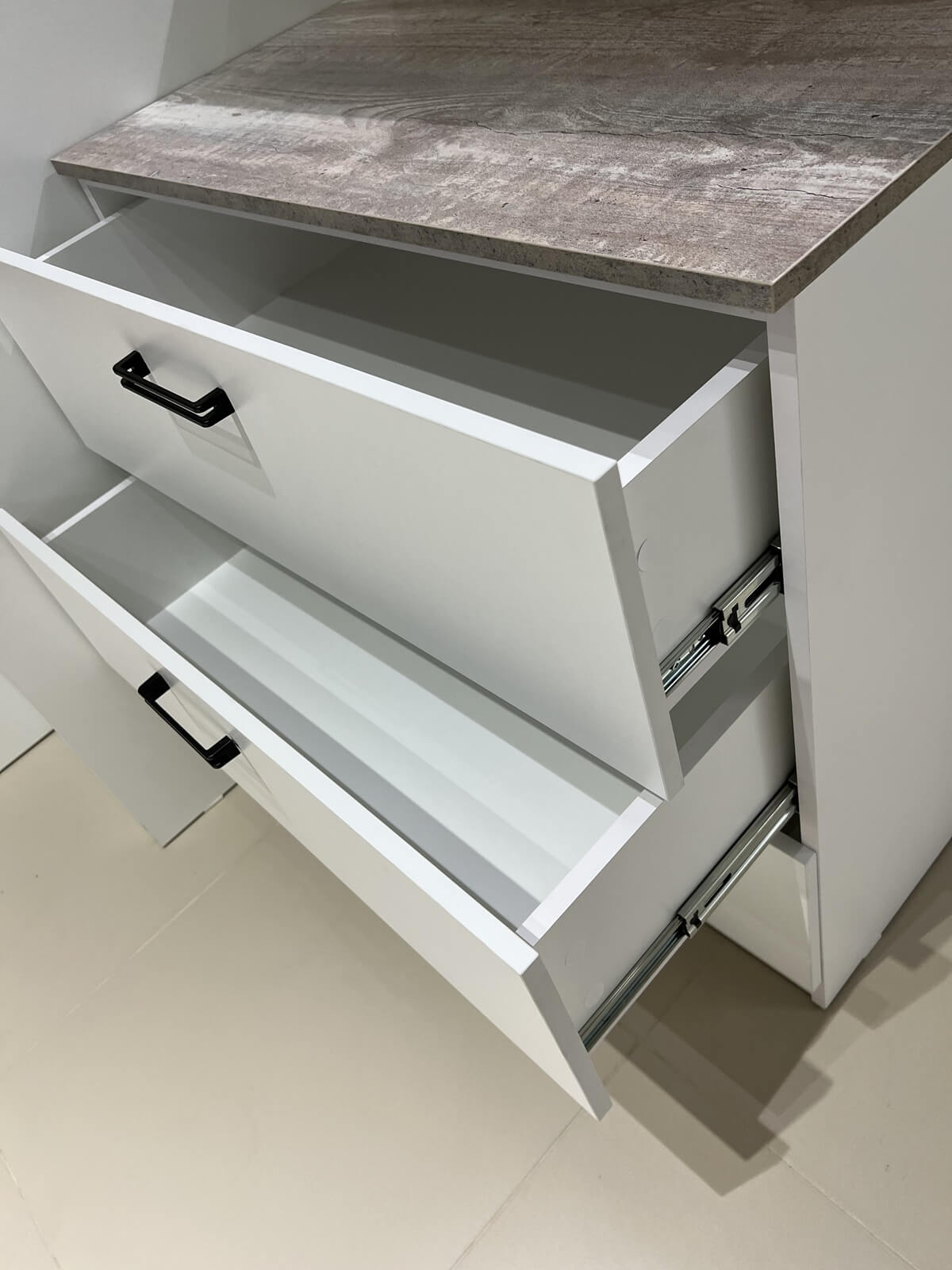 Выдвижные ящики на шариковых направляющих полного выдвижения с доводчиками.