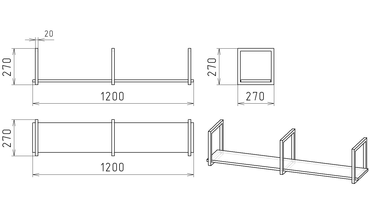 Габариты полки: ширина 1200, глубина 270, высота 270 мм
