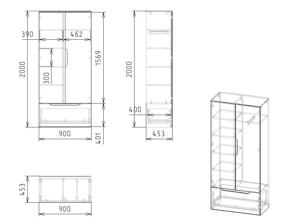 Габариты: ширина 900, высота 2000, глубина 453 мм