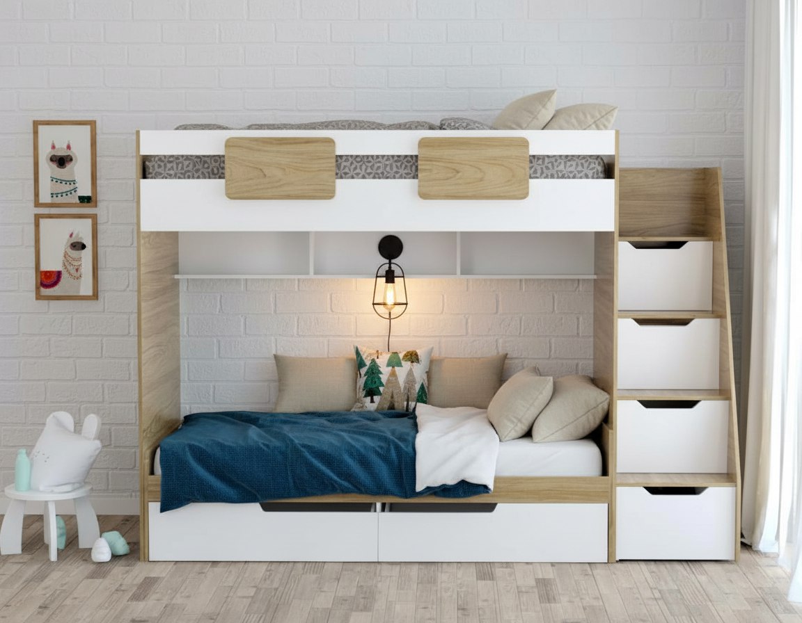 В лестницу и нижнюю кровать встроены выдвижные ящики на шариковых направляющих - удобно и практично.