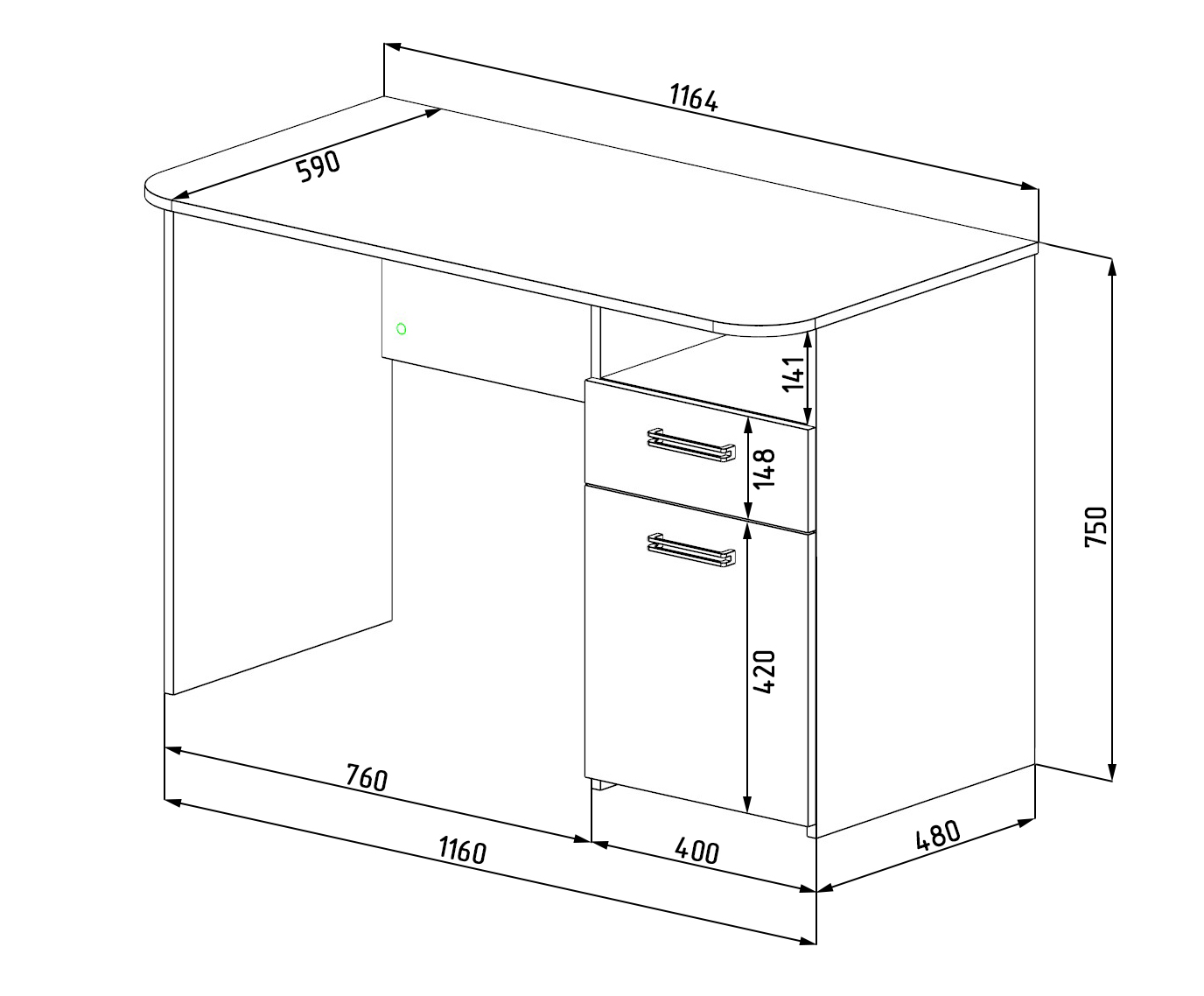 Габариты стола: ширина 1164 х высота 750 х глубина 590 мм