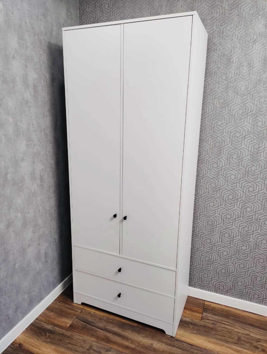 Шкаф поможет максимально грамотно использовать пространство, ведь у него есть два ящика для мелких вещей, штанга, верхние и боковые полки.