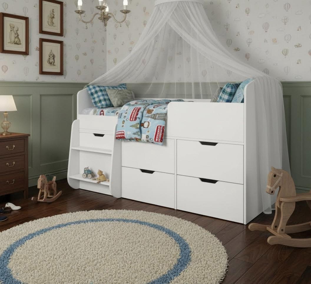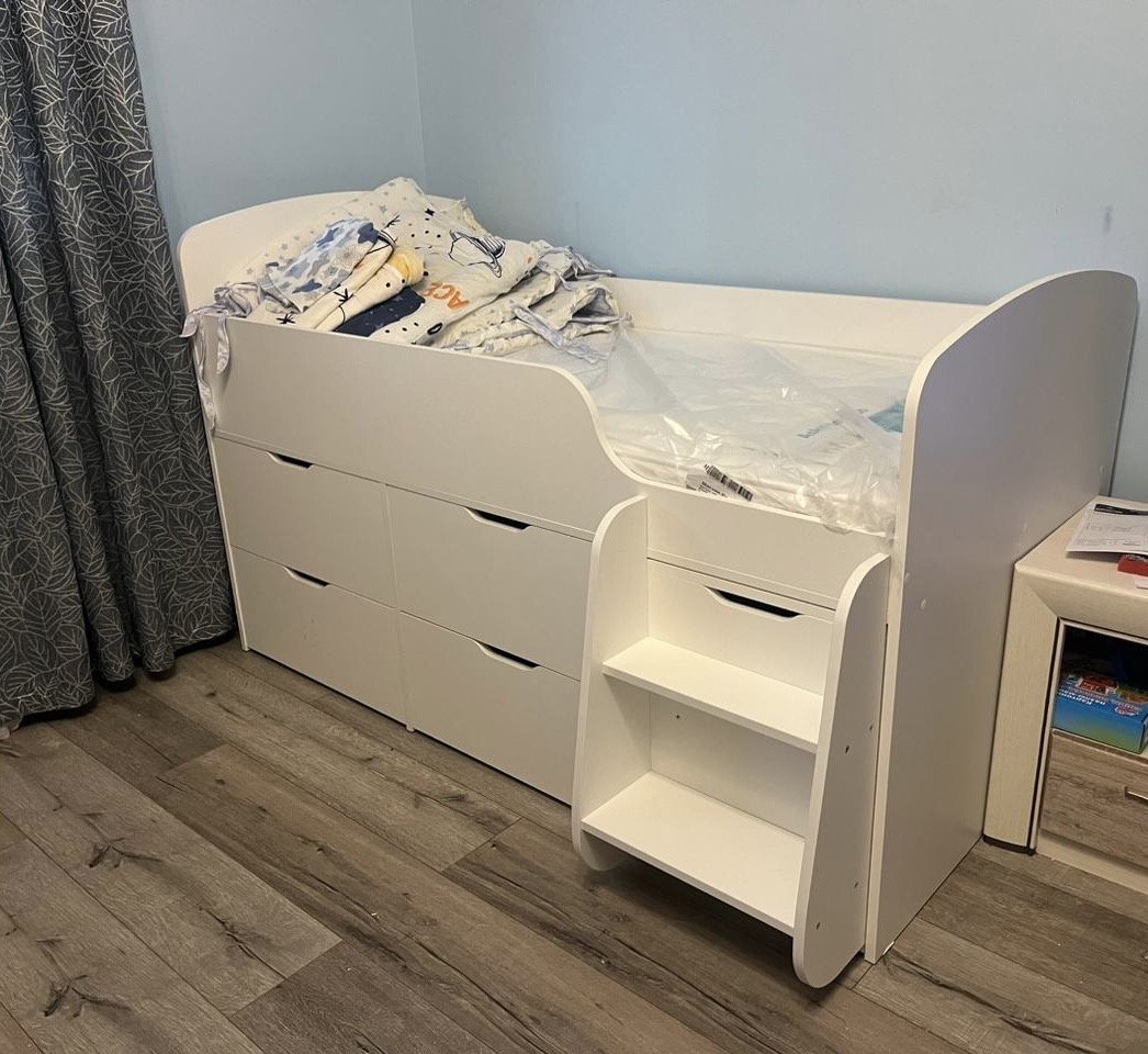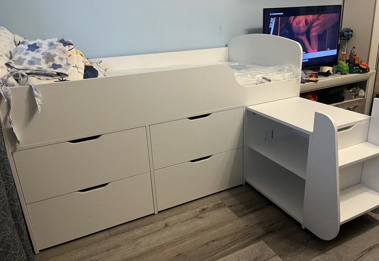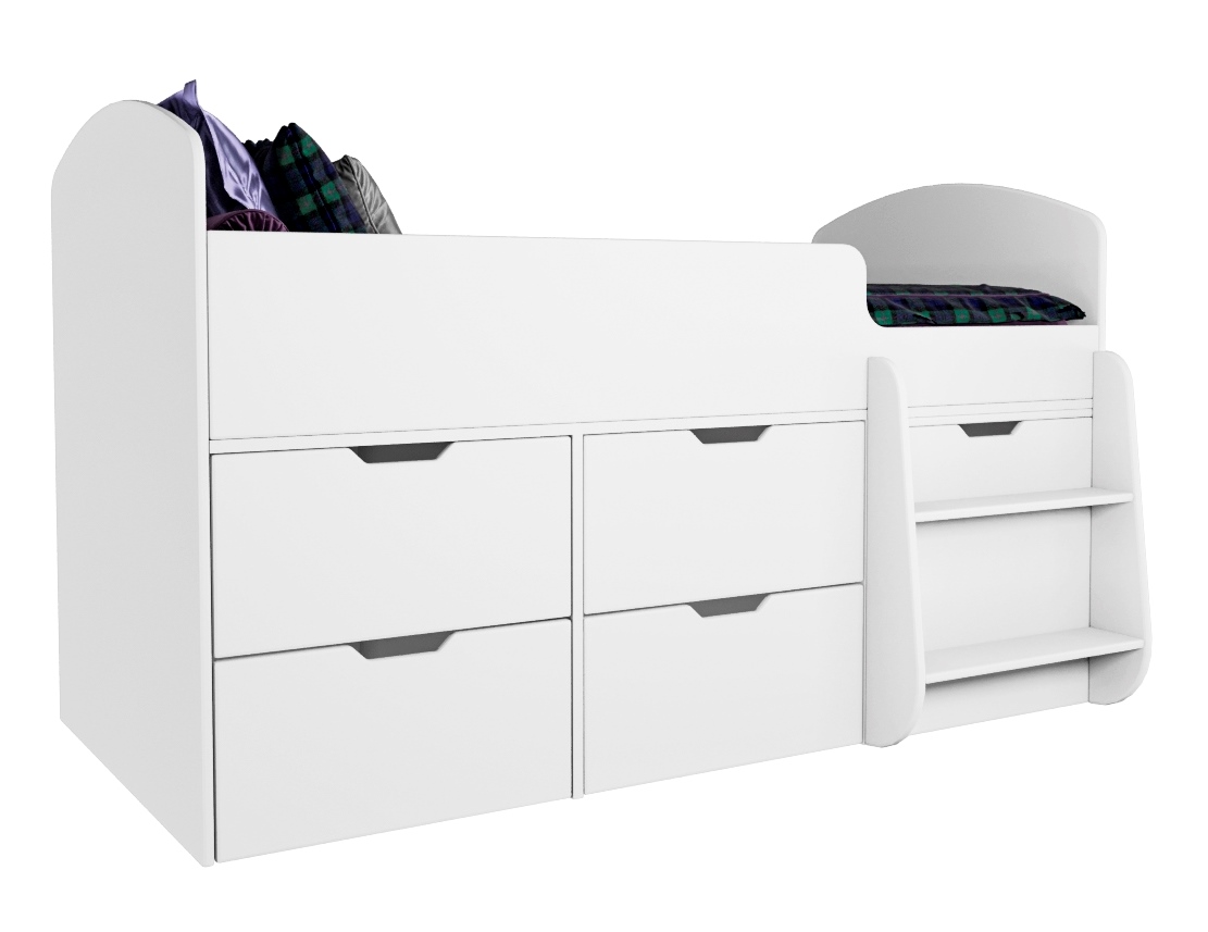 Безопасный, высокий бортик, удобная выдвижная лестница с внутренними полочками и небольшая высота кровати сделаны специально для детей младшего возраста.