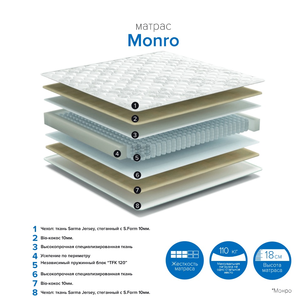 Матрас Монро имеет классическую среднюю жёсткость, блок независимых пружин TFK 120 и 1 см кокосовой койры.