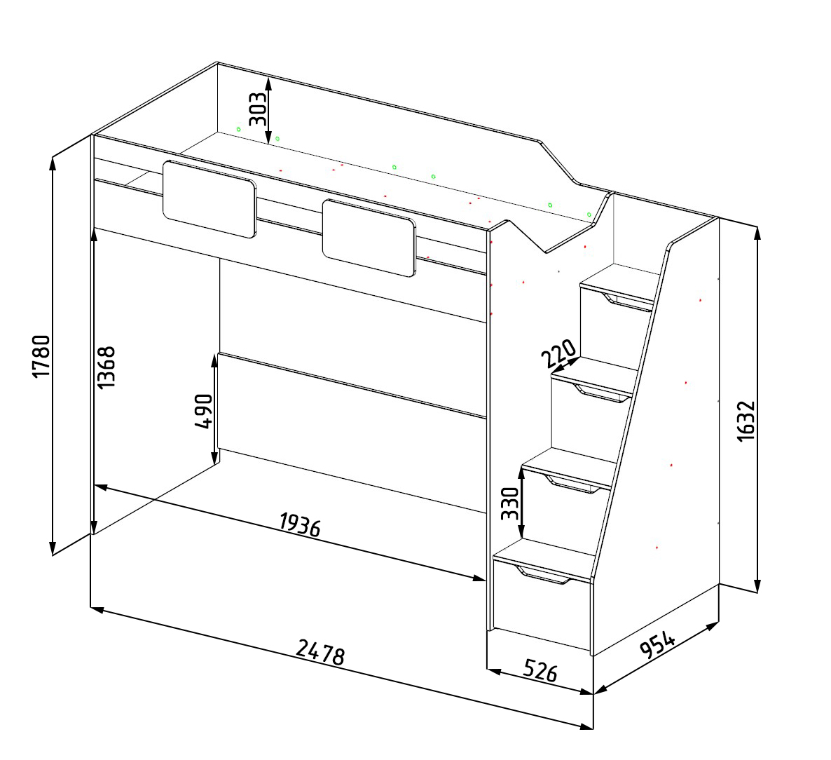 Габариты кровати: ширина с учетом лестницы 2478, глубина 968, высота 1780 мм