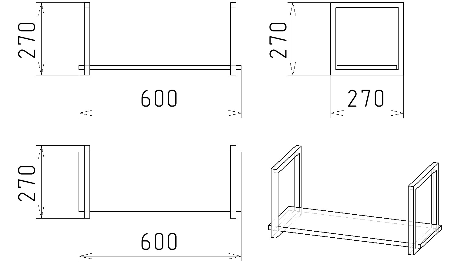 Габариты полки: ширина 600, глубина 270, высота 270 мм