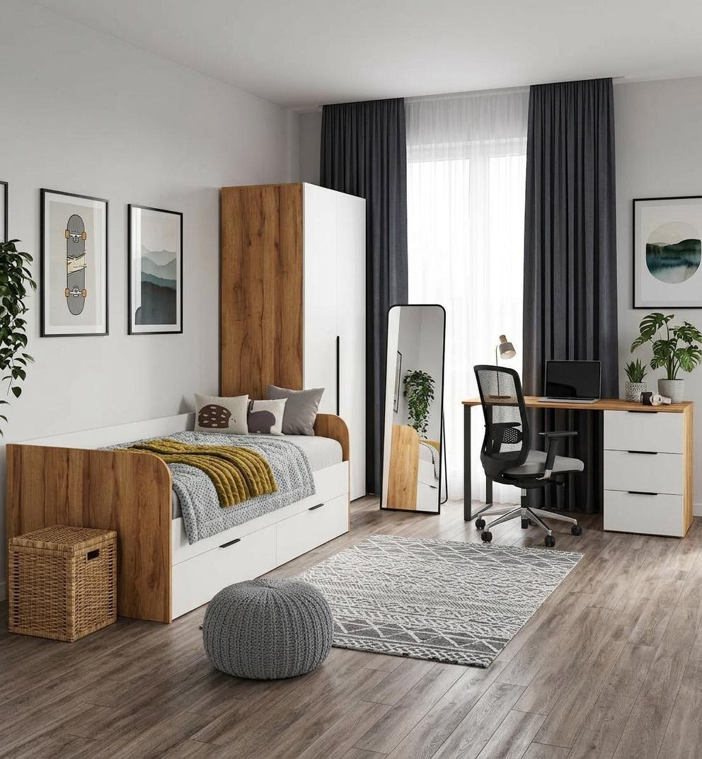 Натуральный декор дуб золотистый с выразительными полосами и следами от сучков прекрасно сочетается с однотонным белоснежным декором.
