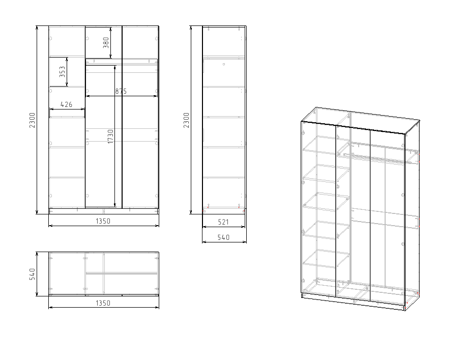 Габариты шкафа: ширина 1350, высота 2300, глубина 540 мм