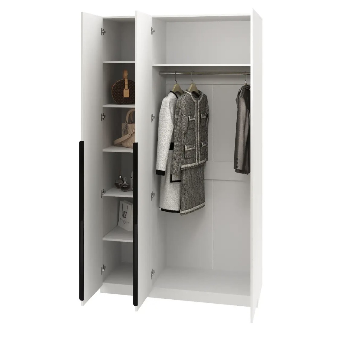 вместительные боковые и верхняя полки, зона с штангой для вешалок.
