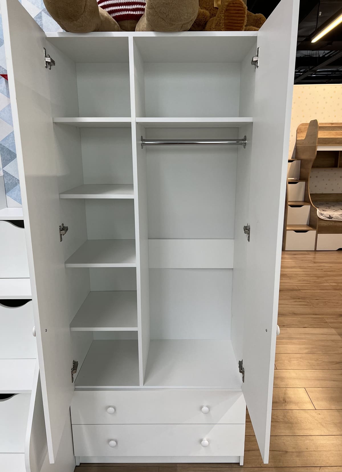 Внутри шкафа имеются штанга для вещей и дополнительные боковые полки.