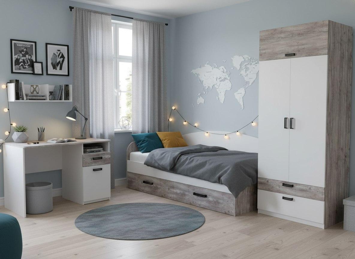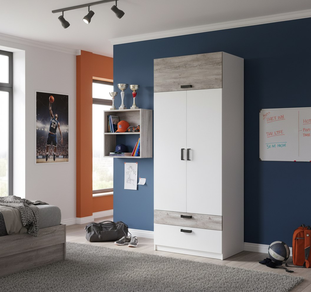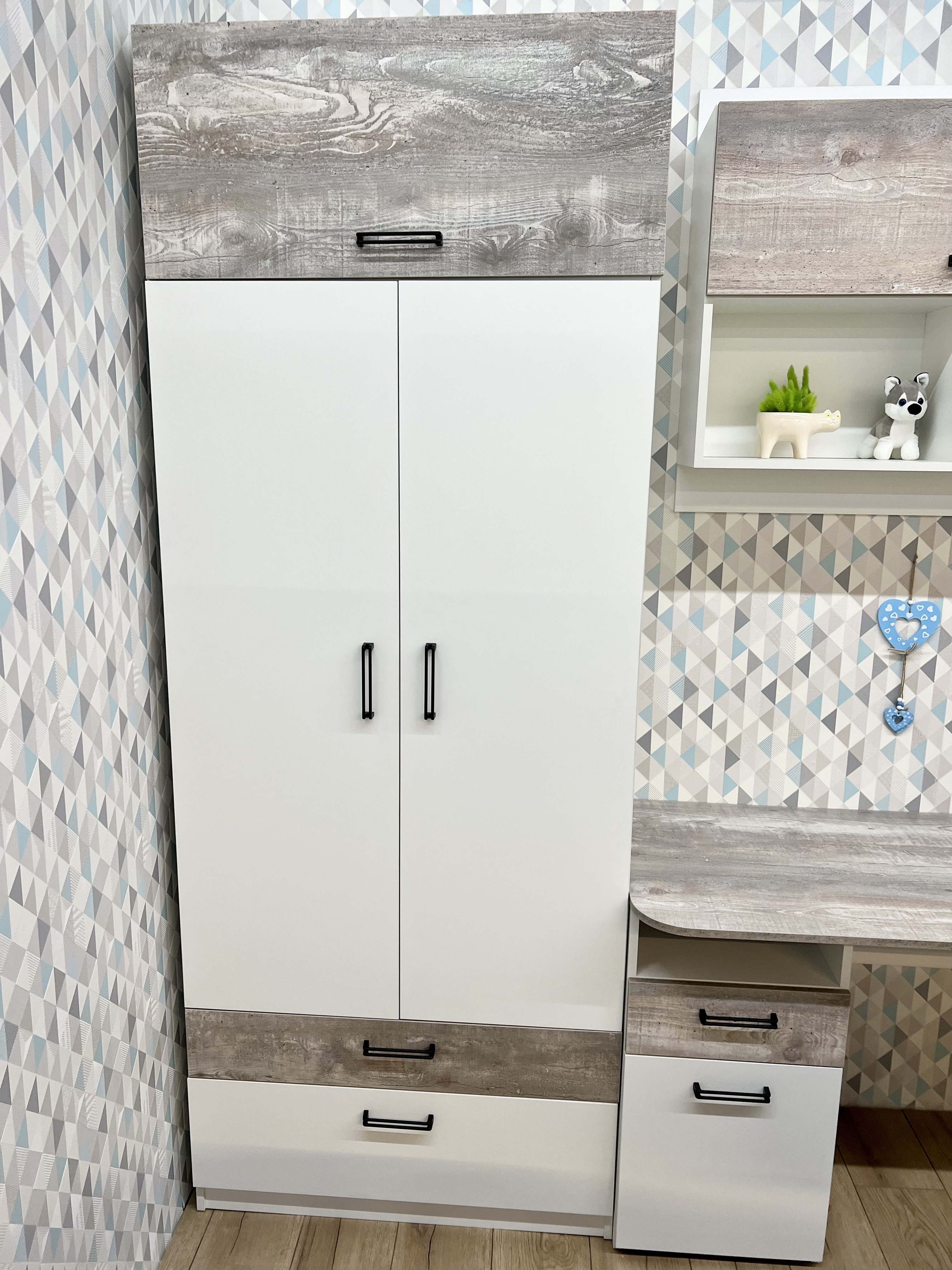 Мебель выполнена из сертифицированного, качественного, экологически чистого ЛДСП класса Е0,5 в сочетании цветов "бетон пайн" + белый.