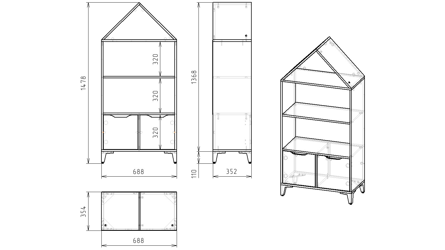 Габариты: высота 1478, глубина 354, ширина 688 мм