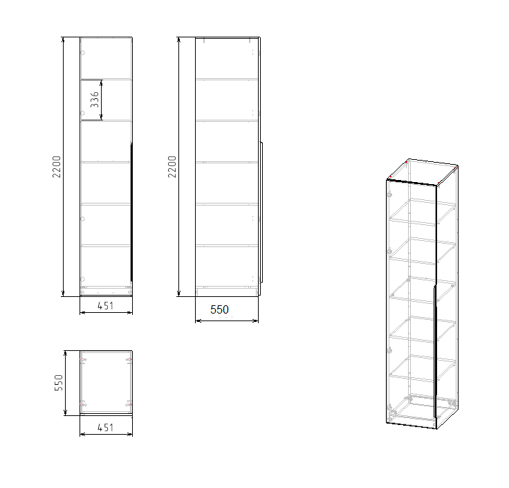 Внутри шкафа расположены две штанги, верхняя и нижняя полки.