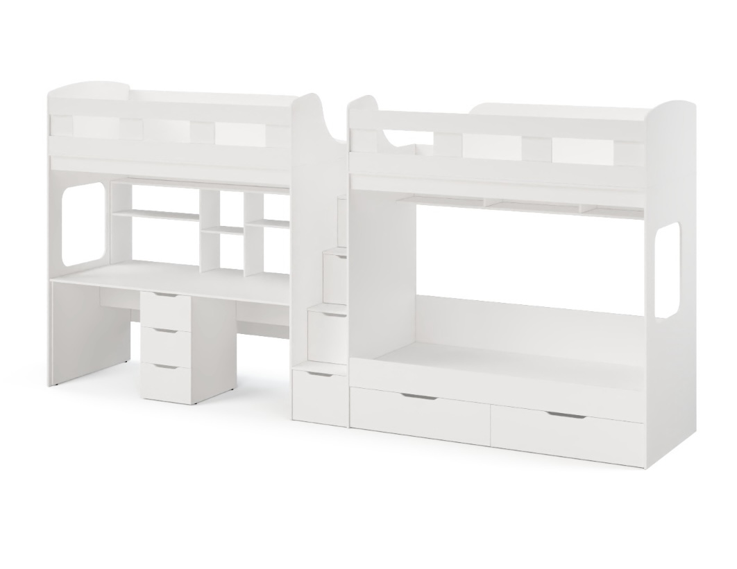 Высокая нагрузка на спальные места. Удобный стол для 2 детей с вместительной полкой. Высокие, безопасные бортики. Прочные ящики! |