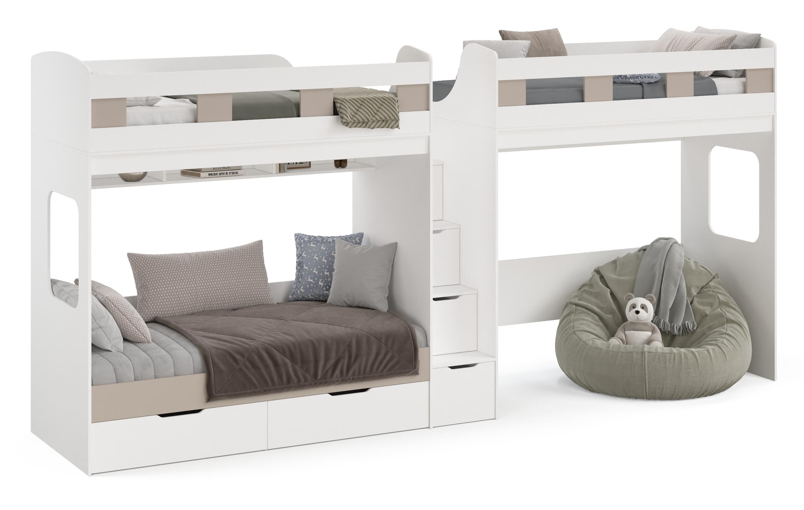 Высокая нагрузка на спальные места.. Удобная лестница-комод. Высокие, безопасные бортики. Прочные ящики! |